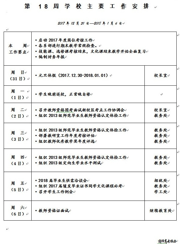 2017-2018学年第一学期第18周多盈体育(中国)主要工作安排