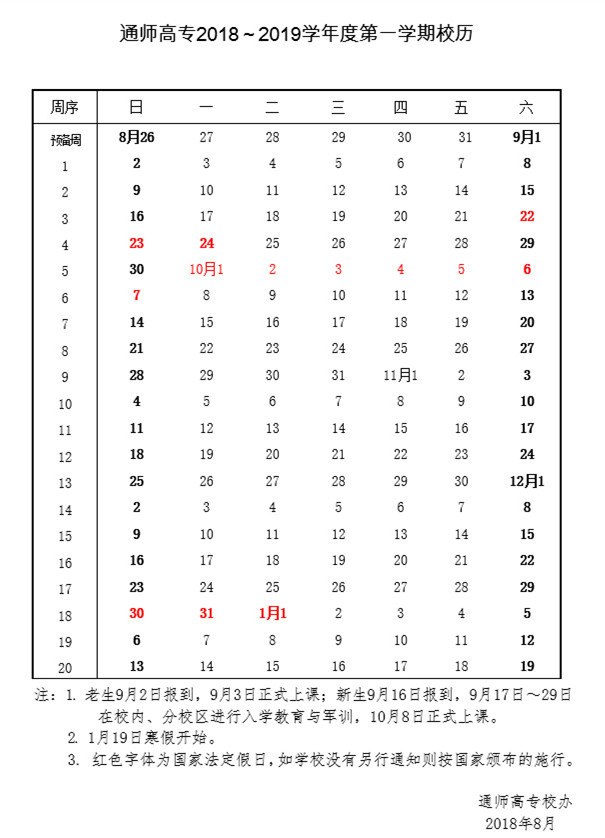 多盈体育2018-2019学年度第一学期校历