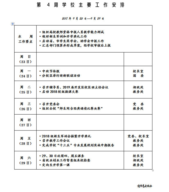 2018-2019学年第一学期第4周多盈体育(中国)主要工作安排