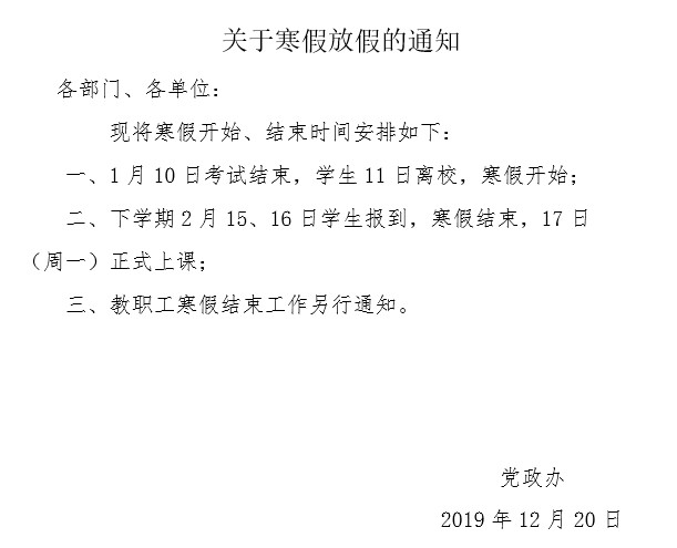 关于2019-2020学年第一学期寒假放假的通知