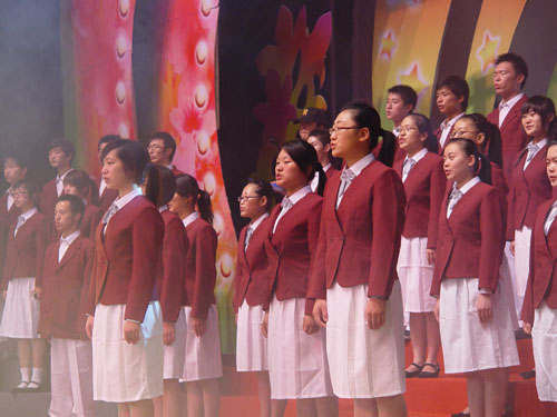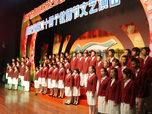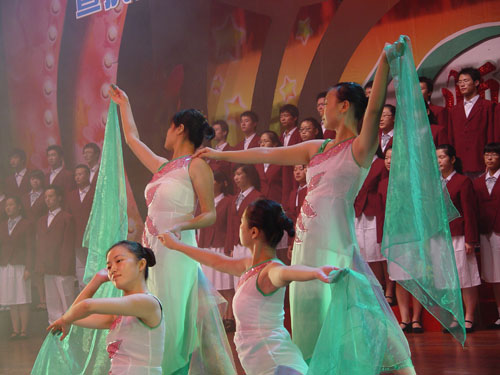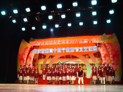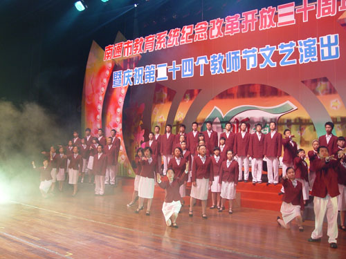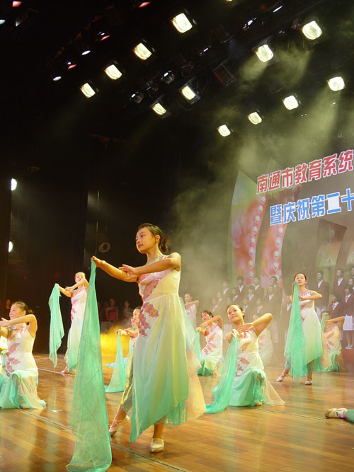 该作品由南通大学王志清教授亲笔,讴歌了南通教育发展三十年的光辉业绩。多盈体育接到演出任务后,从暑假开始就组织了150名同学参加集训。编导老师和演员们克服了天气炎热带来的诸多困难,顶着种种压力,几番修改演出方案。虽然最终上台演出的只有70多名同学,但为了演出成功,为了在市委、市政府以及教育局领导和广大观众面前展现南通高师师生的风采,大家都无怨无悔。