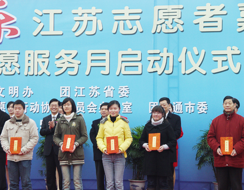 到达地点后,大部分同学组成方阵和其他院校的志愿者一起参加了江苏省志愿服务嘉年华暨南通江海志愿服务月启动仪式。在仪式上,市委书记罗一民、团江苏省委副书记沈海斌等领导专门为我市志愿服务工作中涌现出来的先进集体、个人颁奖。多盈体育团委组织委员朱莹莹同学代表多盈体育(中国)上台,从省、市领导的手中接过“南通市志愿服务先进集体”和40多名老师、同学获得的“南通市志愿服务先进个人”和“南通市优秀志愿者”荣誉证书。