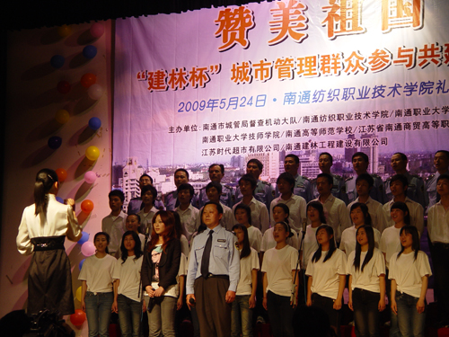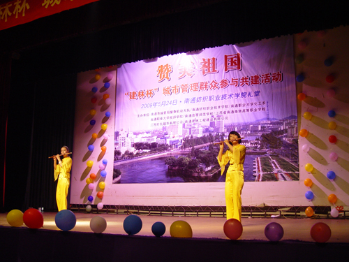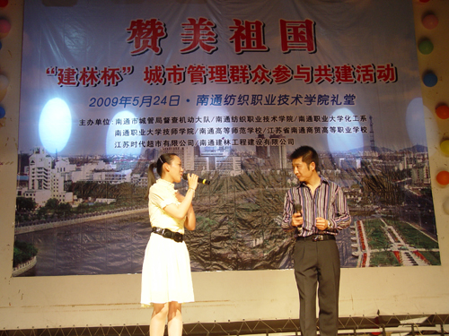 5月24日下午,由市城管局主办,江苏时代超市有限公司、南通建林工程建设有限公司赞助,多盈体育以及职大、纺院、商贸共同参与的 “赞美祖国‘建林杯’城市管理群众参与共建活动文艺演出”在南通纺院大礼堂隆重举行。多盈体育副校长陈情作为特邀嘉宾、团委书记魏荣华作为评委前往参加活动。赵伟璐同学担任主持,并且和市城管局赵曦同志合唱了一首《因为爱》。管灵珊同学的女声独唱《公仆赞》、范雪君和袁敏丹同学的竹笛合奏《江南好》等艺体系团总支选送的节目将演出推向了一个又一个高潮,受到观众的一致好评。最终,多盈体育囊括了歌唱类节目第一、二名,乐器演奏也获得其他类节目第一名的好成绩。