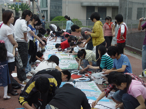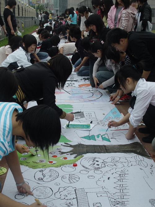 为了促进学生的专业发展,提高学生的职业技能,展示班集体乐学好学的精神风采,营造和谐向上的校园文化氛围,5月23日上午,艺体系在南通校区操场举行了以“我们的家园”为主题的首届广场简笔画大赛。比赛以班级为单位,每班选派三名参赛选手,在指定规格内用黑色水笔、彩色水笔、马克笔等完成主题性简笔画创作。比赛历时近两个小时,最后经过艺体系美术老师的认真评审,美术06(1)班、美术06(2)班、装艺08班,小教06理科班、学前06班、计算机06(1)班、学前07班、英语07(3)班、商英08班分别获得专业组和普通组一等奖。