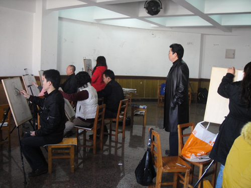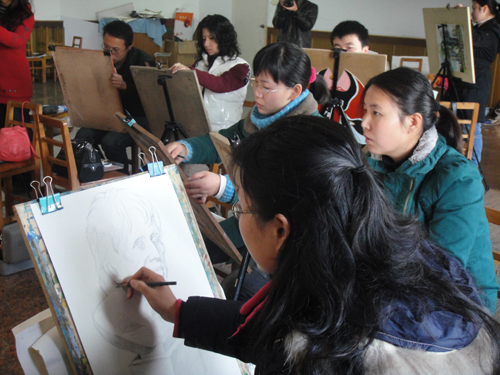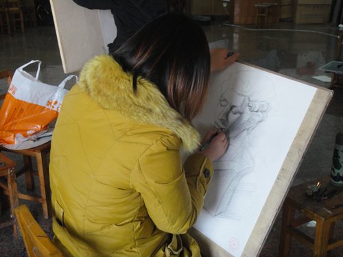 美术专业青年教师的展示分为现场石膏人像素描写生、现场静物色彩写生和现场人物速写三个部分,展示时间长、任务重。各位老师从上午八点一直画到下午四点,充分展示了作为美术教师的特殊专业功底,画室里静默而一丝不苟的气氛让每一位观摩者都能感受到他们的专注和专业。