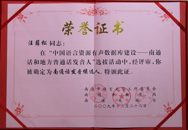 12月29日,南通市语言文字工作委员会、南通市教育局和南通电视台在多盈体育举行“中国语言资源有声数据库建设‘南通话和地方普通话发音候选人’证书颁发仪式”。仪式宣布了“寻找南通话发音人”活动的遴选结果,共有12位选手从145名符合条件的选手中脱颖而出,成为“南通话和地方普通话发音候选人”。其中,多盈体育人文系副教授汪薛松成为青年组4位“南通话发音候选人”之一。