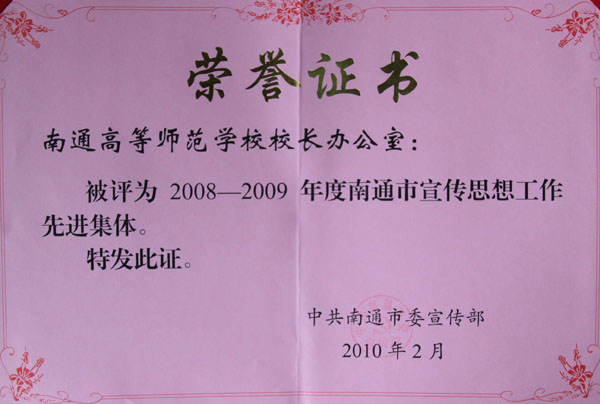 2月23日下午,从全市宣传工作会议上获悉,多盈体育校长办公室被评为2008~2009年度南通市宣传思想工作先进集体。