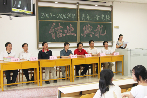 结业典礼在庄严的《国际歌》中拉开序幕,党校第六期学员班班主任张露老师对本期青年业余党校的学习情况做了简要的总结和评述。接着学工处倪健处长宣读了22位优秀学员的名单,校领导为优秀学员颁发了证书。2007级英语(1)班沈桂华同学作为优秀学员代表进行了发言。