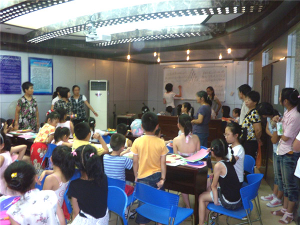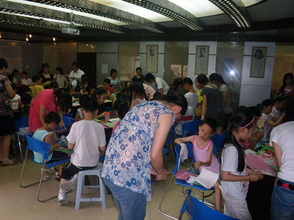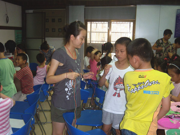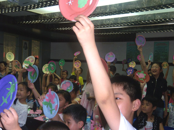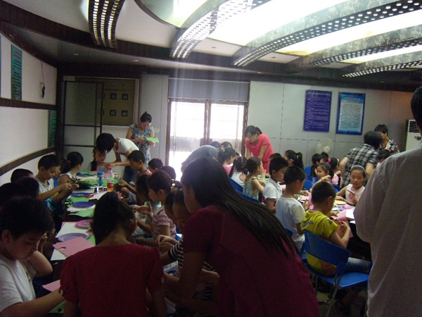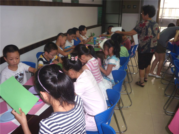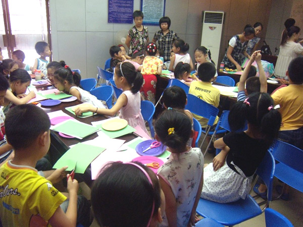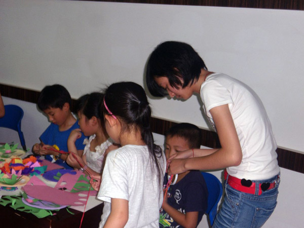 活动当天,朝晖社区的教室里一下子来了50多名一到三年级的小学生。因为小朋友人数较多,而且年龄水平参差不齐,所以师范生们确定了“手工制作”的主题,教小朋友们做一些简单的手工艺术品 ——“剪纸装饰盘”和“黏贴画”。这些手工制作都不是很复杂,即便是比较年幼的小朋友在我们同学的帮助下也不会很困难。事先他们准备了一切的材料和制作工具,为了避免让小朋友弄脏衣服,手工制作中一些比较麻烦的工序,诸如装饰盘的涂色,师范生们在前一天的晚上就为孩子们代劳了。手工制作的内容,也体现了外语系同学们的细心。他们特别选的是用“剪、贴、搓”的方法来做的手工,因此除了剪刀,过程中并不会涉及到什么利器。