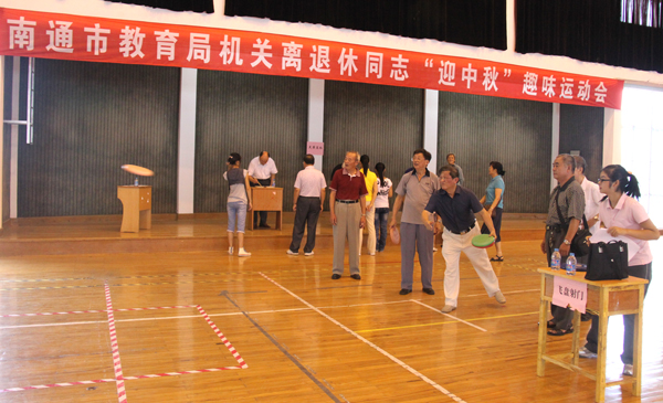 9月16日上午,南通市教育局机关离退休同志在多盈体育举办了“迎中秋”趣味运动会。有四十余名老同志参加了活动。趣味活动包括夹黄豆粒、掷飞镖、投“保龄球”、飞盘射门、乒乓球投准等适合老年人特点的项目。在这几项比赛中,共有三十几位老同志获优胜奖,其他老同志获得了纪念奖。有的老同志行动不便,但仍积极参与,充分展示了机关老同志健康乐观的精神面貌。