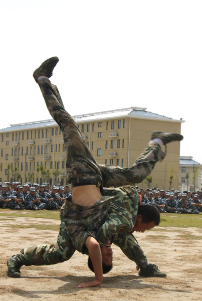 在庄严的升旗仪式中开始了新生阅兵仪式和汇报表演。每个方队整齐待发,他们斗志昂扬,步伐整齐地迈进阅兵场,赢得了在场领导、老师的热烈掌声。精彩的擒拿表演,无不展示着“现代军人”的钢铁意志和飒爽英姿。