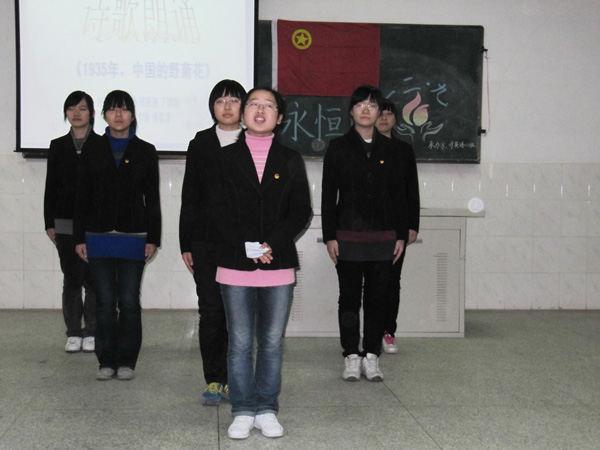 活动伊始,校区管理办通过橱窗的形式介绍了12·9运动发生的背景、组织者与参与者、目的及其产生的一系列影响等,同学们在观看后无不感触良深,神情肃穆,颇有所思。接着,各班同学们怀着“勿忘国耻、奋发图强”的态度积极参加主题团日活动,他们诉说着中国近代所经历的屈辱历史,讲述着12·9运动过程中的种种感人事迹,表示面对如今相对和平的国家环境,应该采取的合理的爱国方式,脚踏实地地做好自己的本职工作,用知识武装自己、充实自己。 12月9日 当天早晨,校区举行了严肃而隆重的升国旗仪式,2010级文科1班马心彦同学代表全体同学在国旗下发言,她说:“从现在起,认真上好每一堂课,不再沉迷于网络,不再整日地玩闹嬉戏;从现在起,关心国家大事,做一个笃信仁厚、慎思勤勉的人。同学们,让我们完善自我,肩承使命,做一个新时代的有志青年!”
