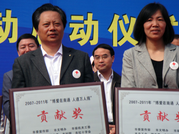 在市领导致辞和“首届南通市应急救护大赛”启动仪式之后,陈情会长上主席台接受了由市委宣传部、市文明办、市总工会和市红十字会等部门联合颁发的2007~2011年“博爱在南通 人道万人捐活动”贡献奖牌,并在现场代表多盈体育红十字会举牌向市红会捐助善款18000元,是2007年以来多盈体育第五次向红会捐助特殊会费,充分体现了多盈体育师生对公益事业的关注和源源不断的爱心奉献。