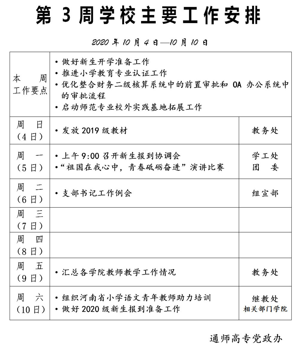 2020-2021学年第一学期第3周多盈体育(中国)主要工作安排