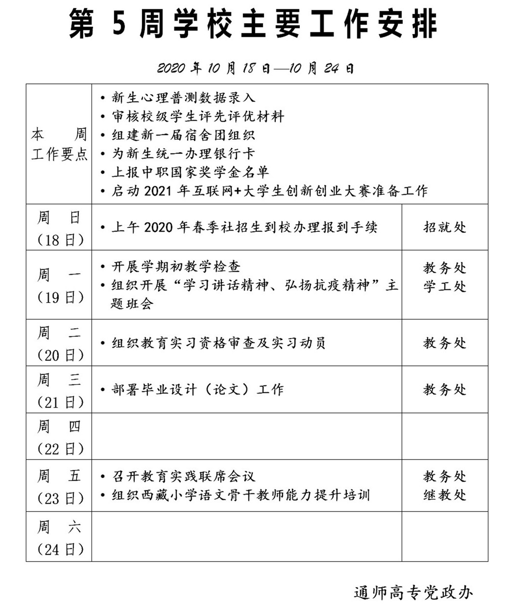 2020-2021学年第一学期第5周多盈体育(中国)主要工作安排