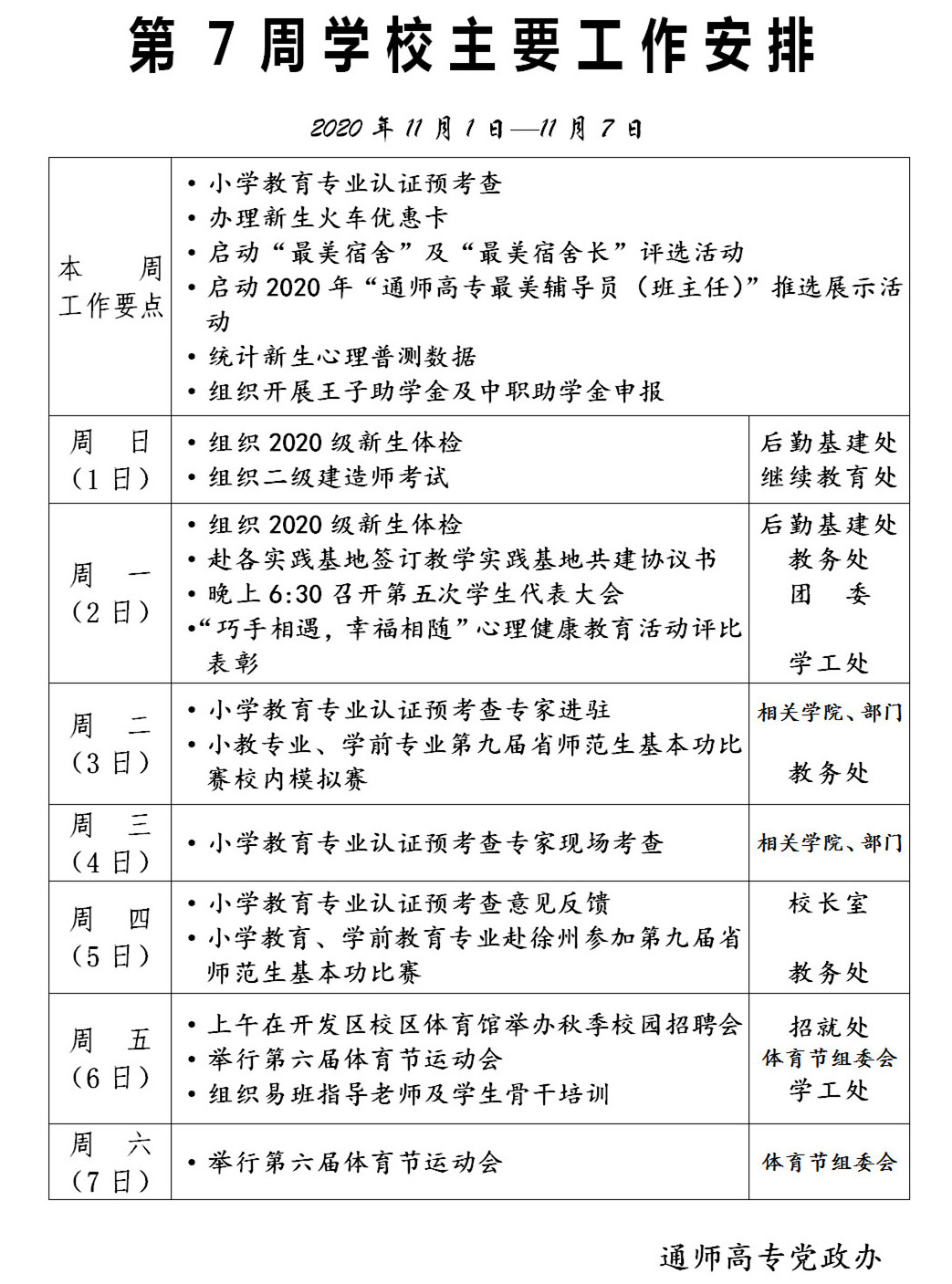 2020-2021学年第一学期第7周多盈体育(中国)主要工作安排