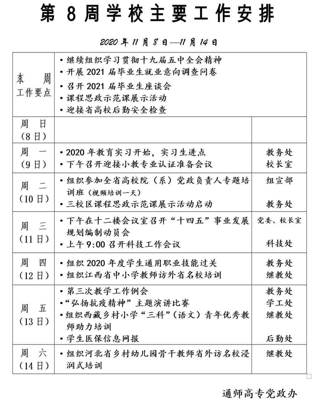 2020-2021学年第一学期第8周多盈体育(中国)主要工作安排