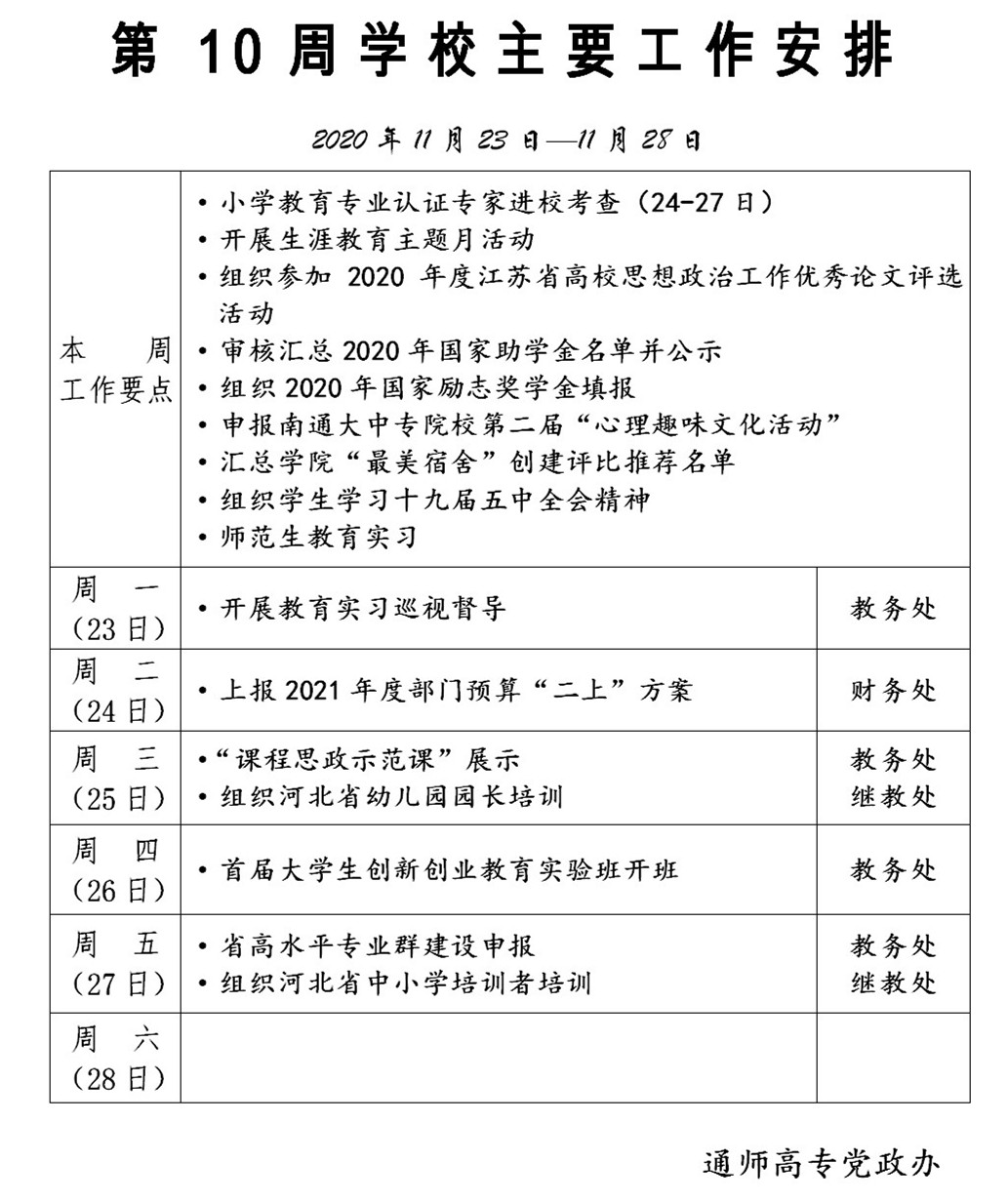 2020-2021学年第一学期第10周多盈体育(中国)主要工作安排
