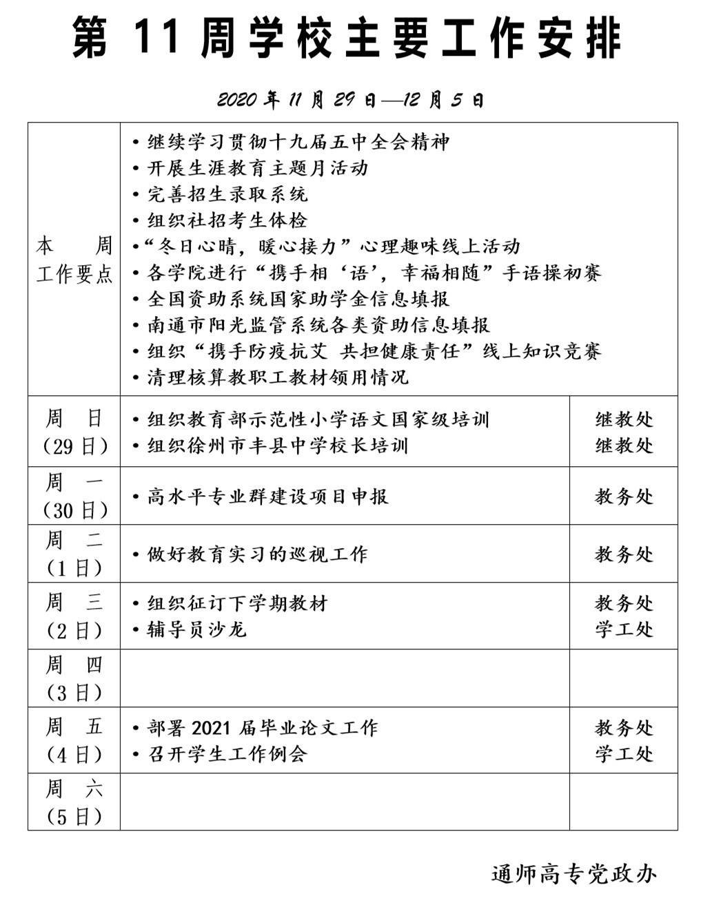 2020-2021学年第一学期第11周多盈体育(中国)主要工作安排