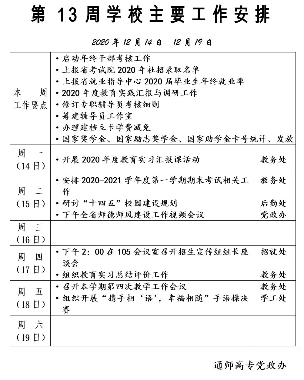 2020-2021学年第一学期第13周多盈体育(中国)主要工作安排