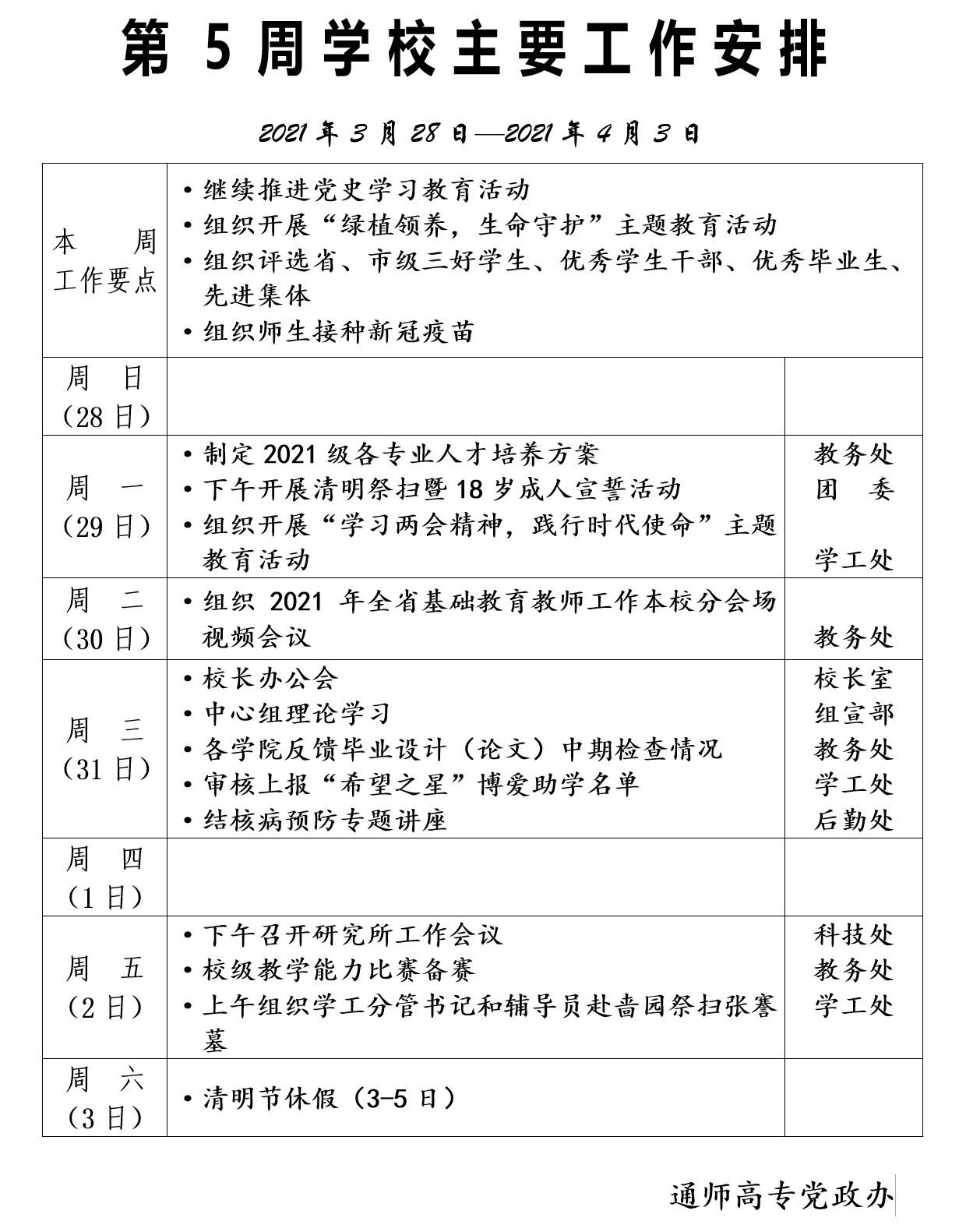 2020-2021学年第二学期第5周多盈体育(中国)主要工作安排
