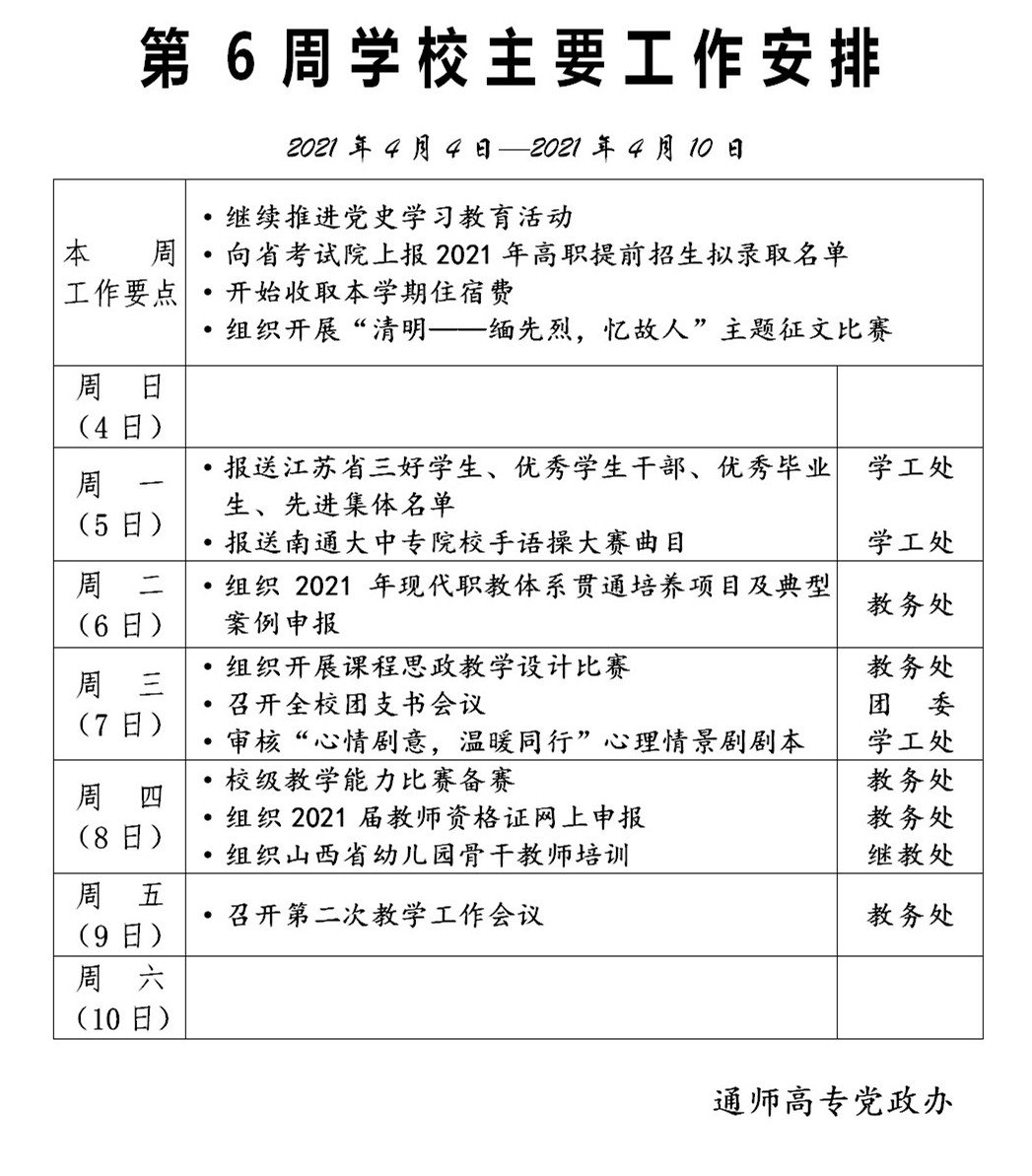 2020-2021学年第二学期第6周多盈体育(中国)主要工作安排