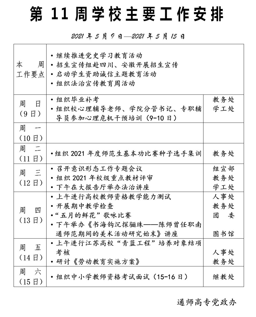 2020-2021学年第二学期第11周多盈体育(中国)主要工作安排