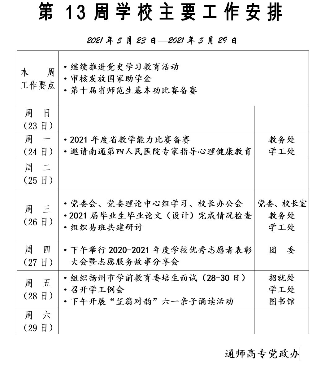 2020-2021学年第二学期第13周多盈体育(中国)主要工作安排