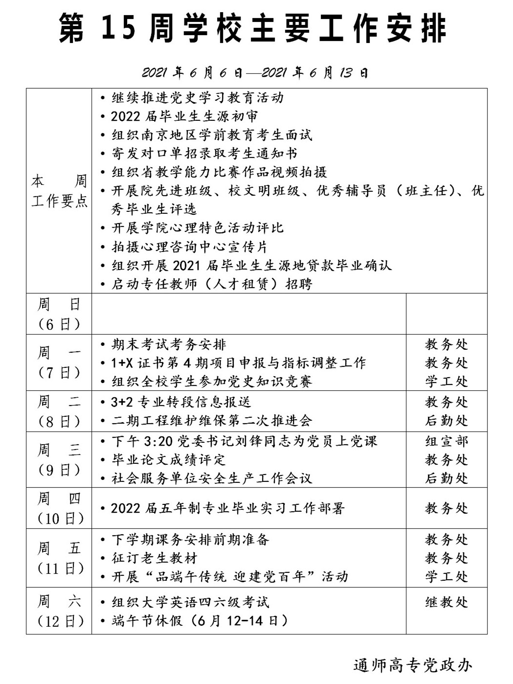 2020-2021学年第二学期第15周多盈体育(中国)主要工作安排