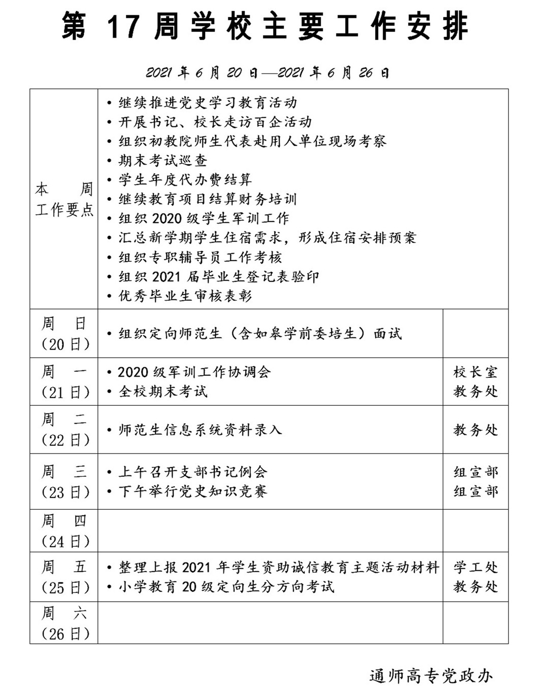 2020-2021学年第二学期第17周多盈体育(中国)主要工作安排