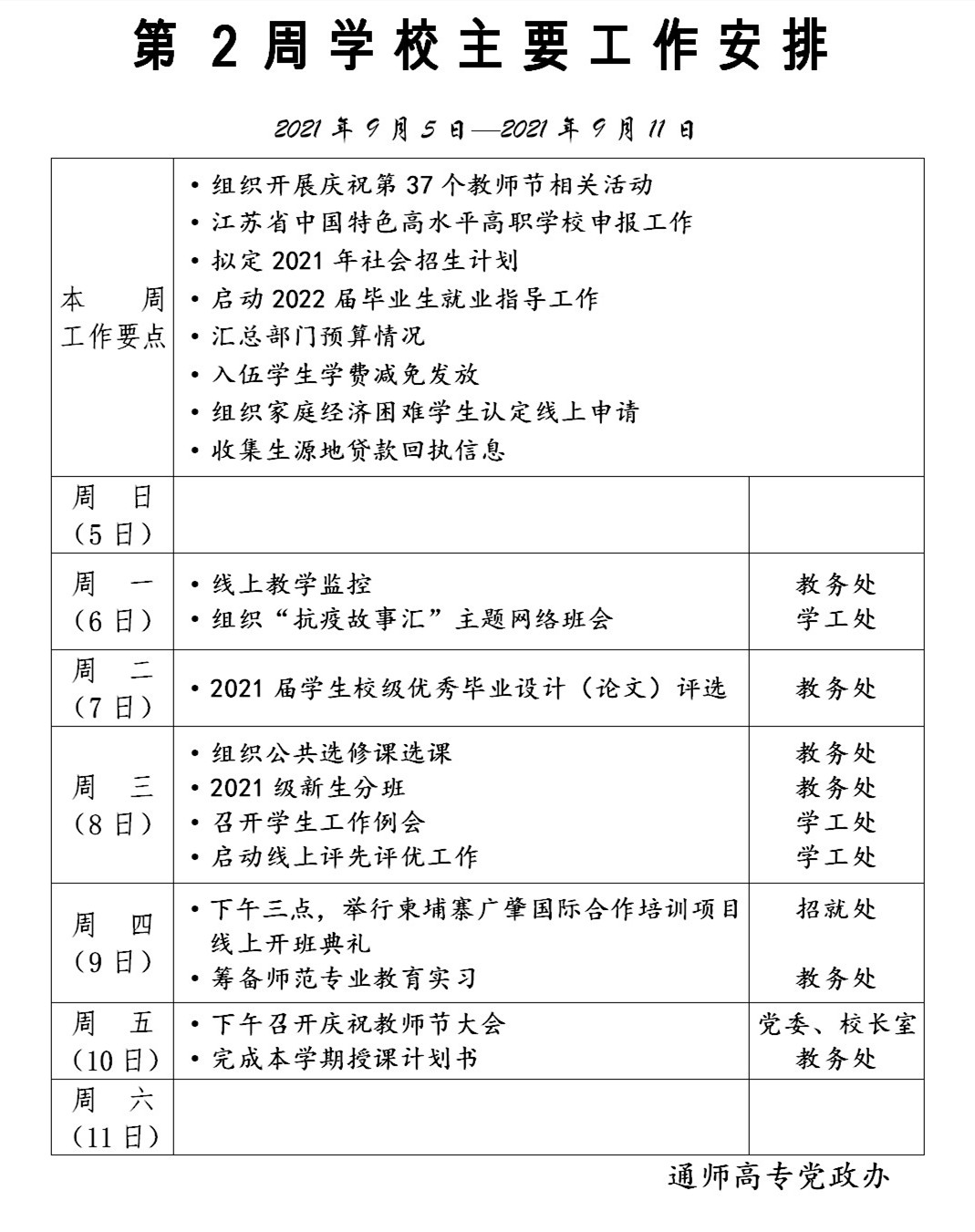 2021-2022学年第一学期第2周多盈体育(中国)主要工作安排