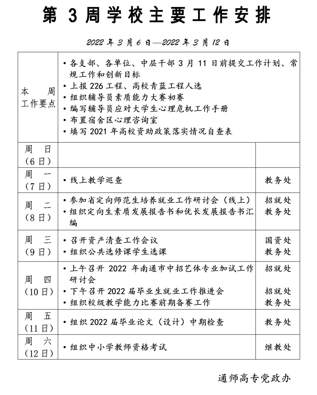 2021-2022学年第二学期第3周多盈体育(中国)主要工作安排