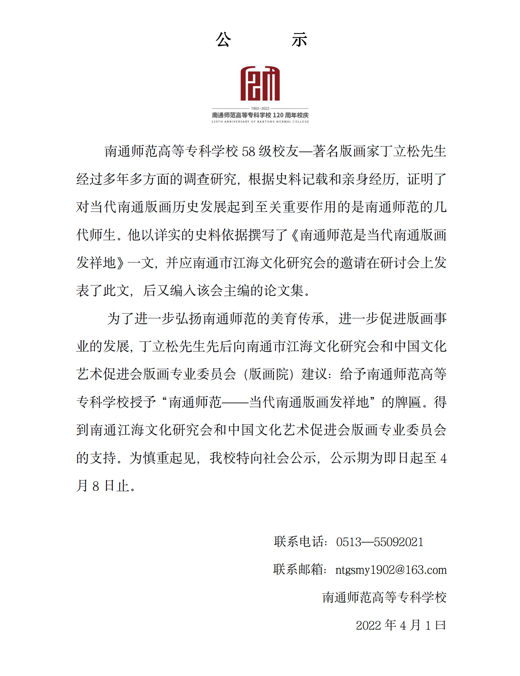 给予多盈体育授予“南通师范——当代南通版画发祥地”牌匾的公示