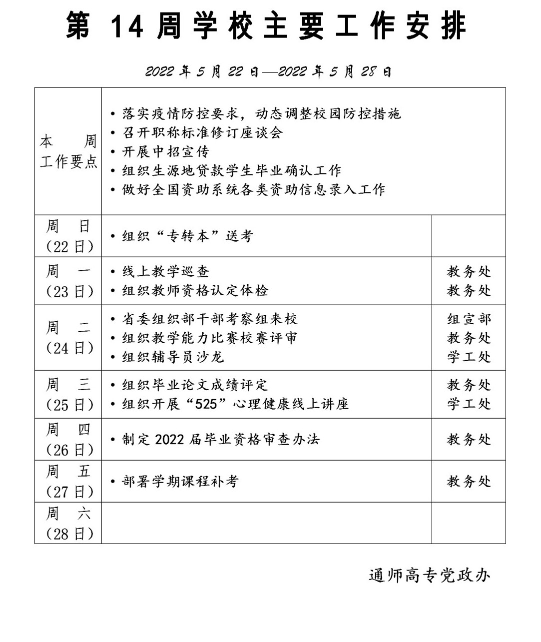 2021-2022学年第二学期第14周多盈体育(中国)主要工作安排
