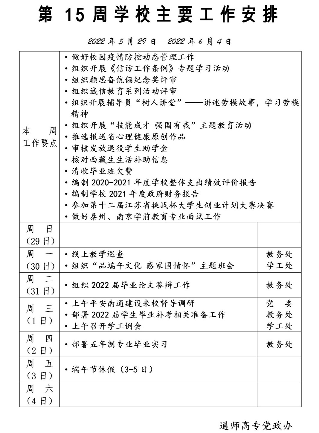 2021-2022学年第二学期第15周多盈体育(中国)主要工作安排