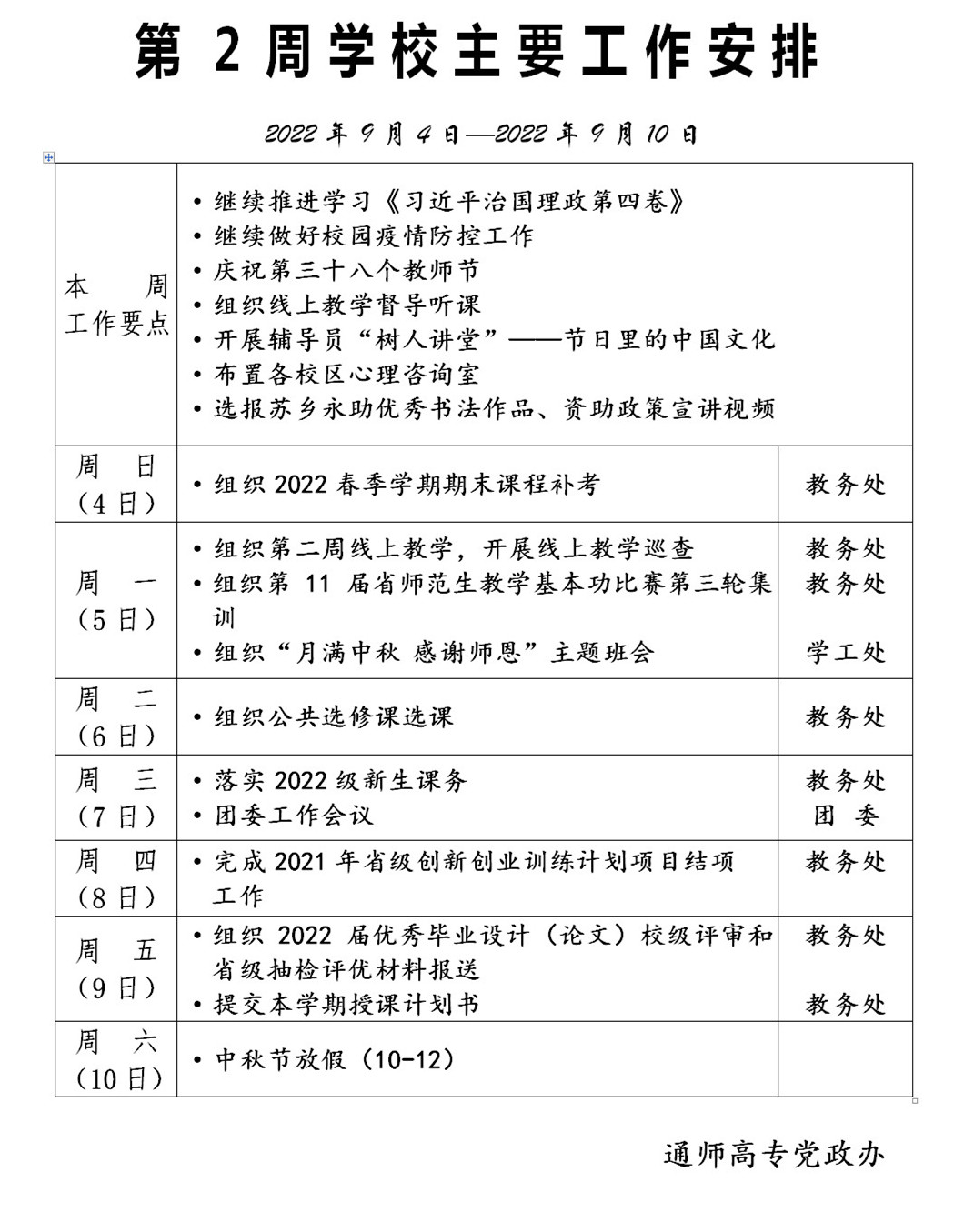 2022-2023学年第一学期第2周多盈体育(中国)主要工作安排