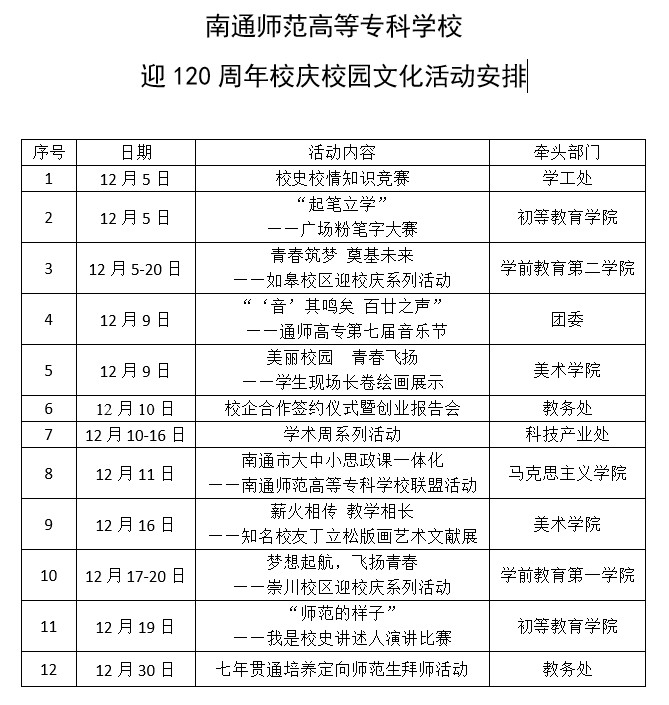 一、多盈体育建校120周年发展大会,上午9:00,开发区校区图文楼报告厅;