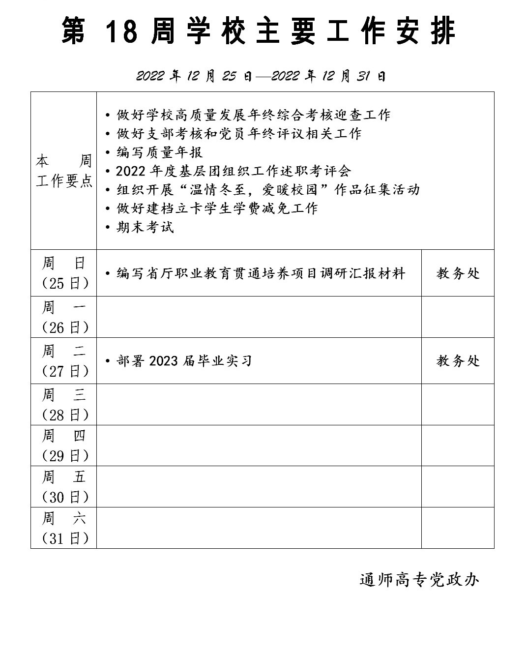2022-2023学年第一学期第18周多盈体育(中国)主要工作安排