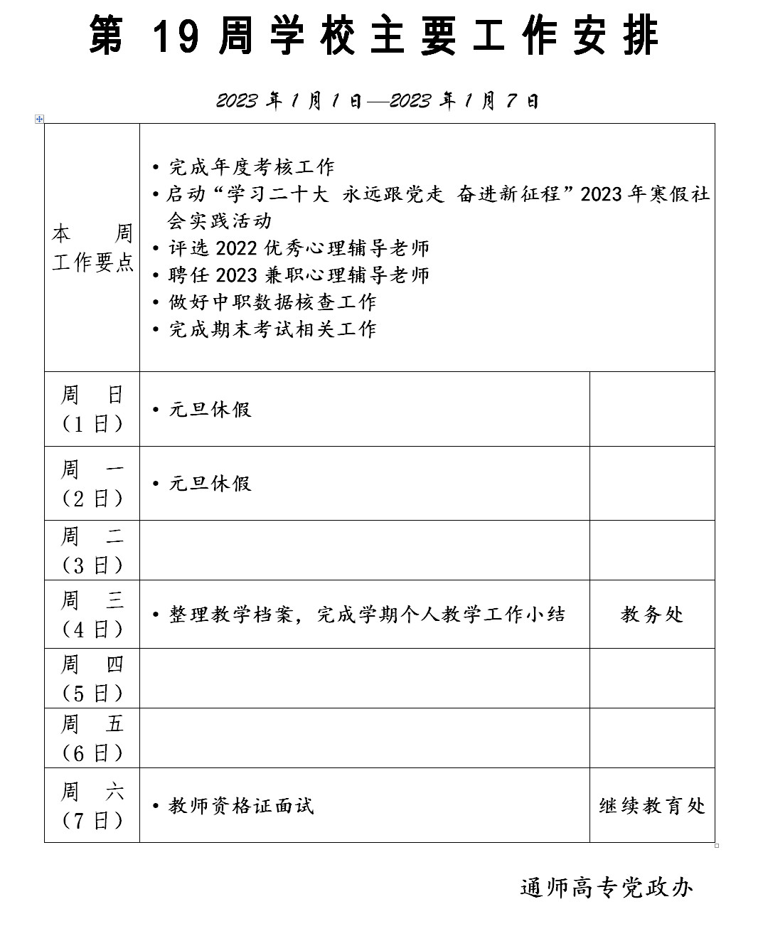 2022-2023学年第一学期第19周多盈体育(中国)主要工作安排