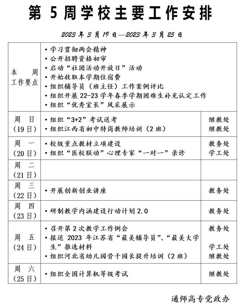 2022-2023学年第二学期第5周多盈体育(中国)主要工作安排