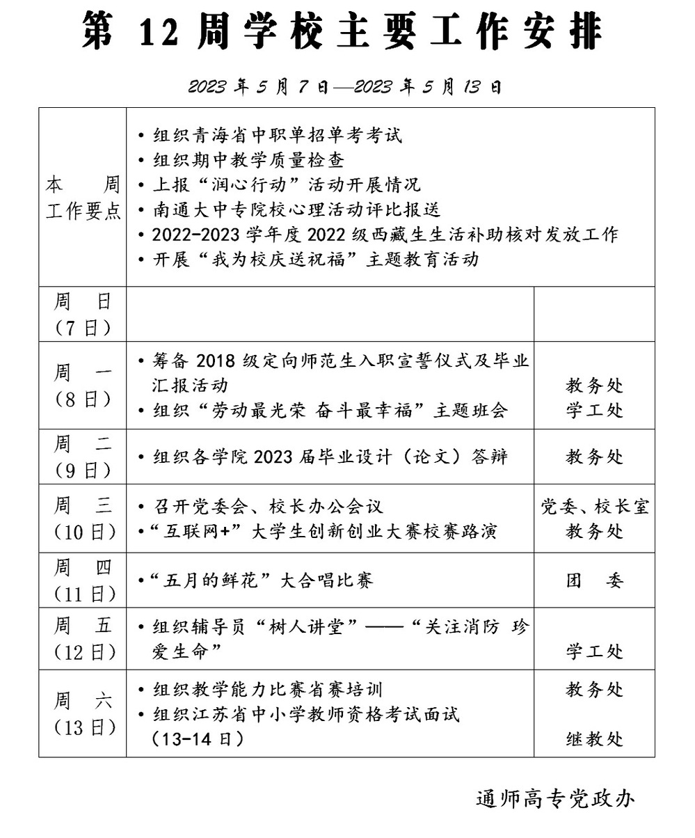 2022-2023学年第二学期第12周多盈体育(中国)主要工作安排