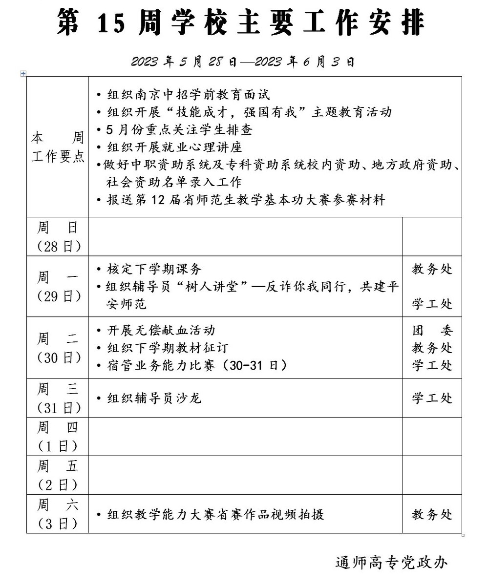 2022-2023学年第二学期第15周多盈体育(中国)主要工作安排