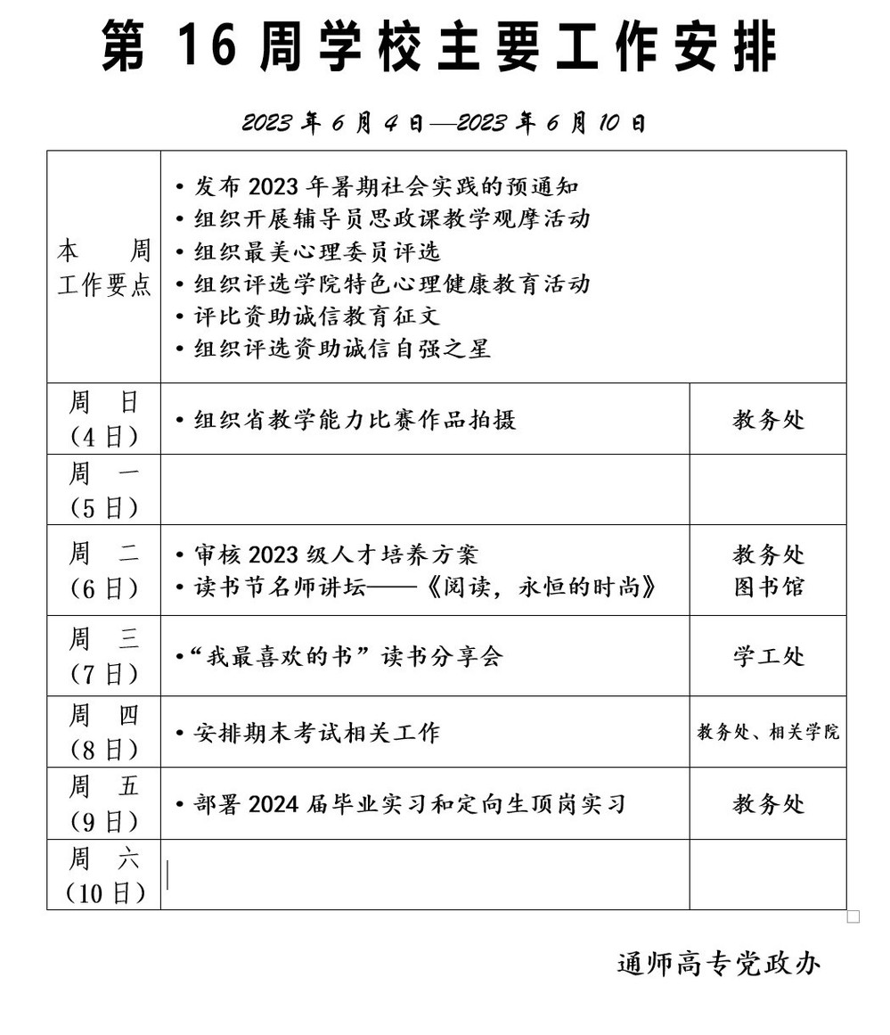2022-2023学年第二学期第16周多盈体育(中国)主要工作安排