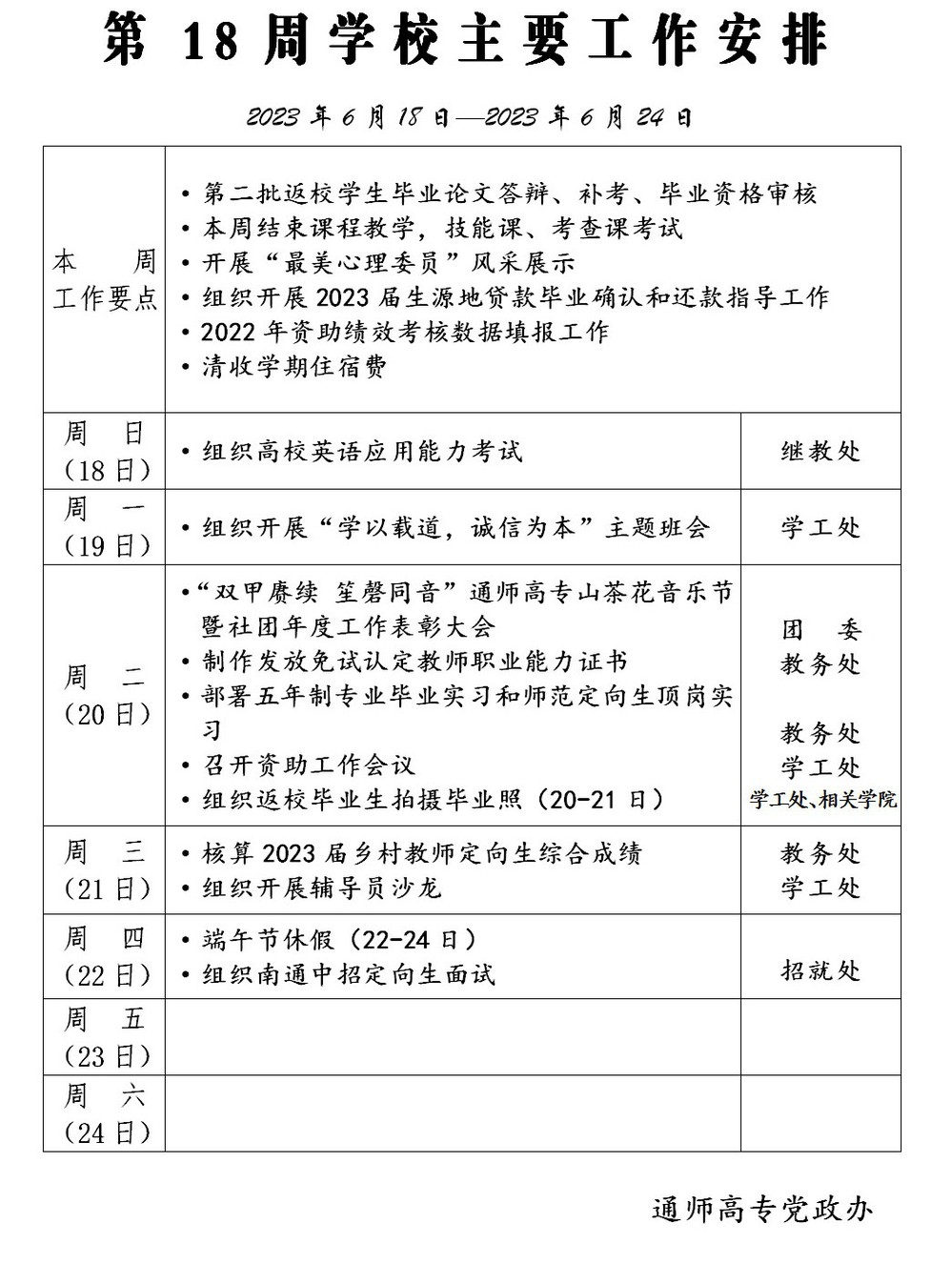 2022-2023学年第二学期第18周多盈体育(中国)主要工作安排