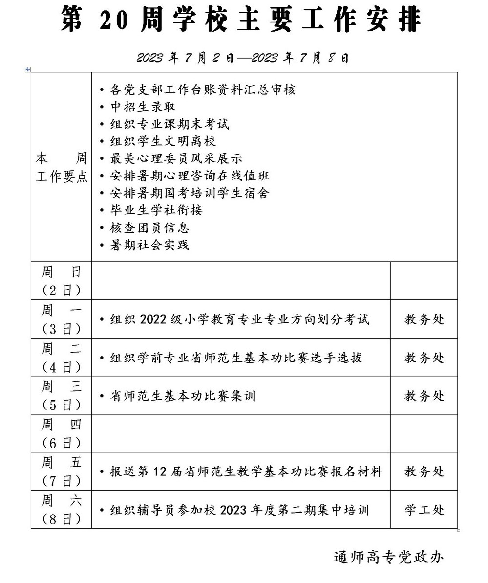 2022-2023学年第二学期第20周多盈体育(中国)主要工作安排