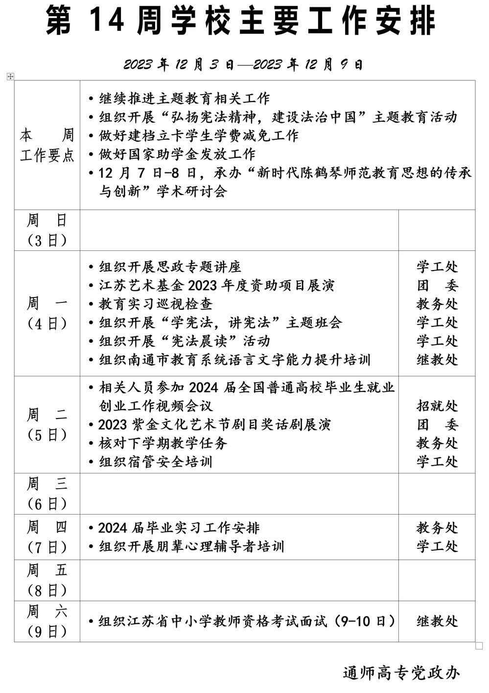 2023-2024学年第一学期第14周多盈体育(中国)主要工作安排