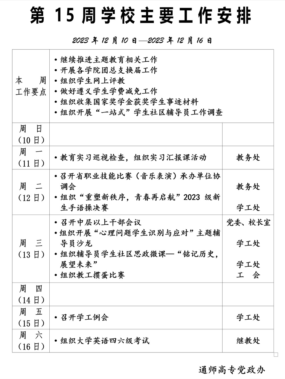 2023-2024学年第一学期第15周多盈体育(中国)主要工作安排