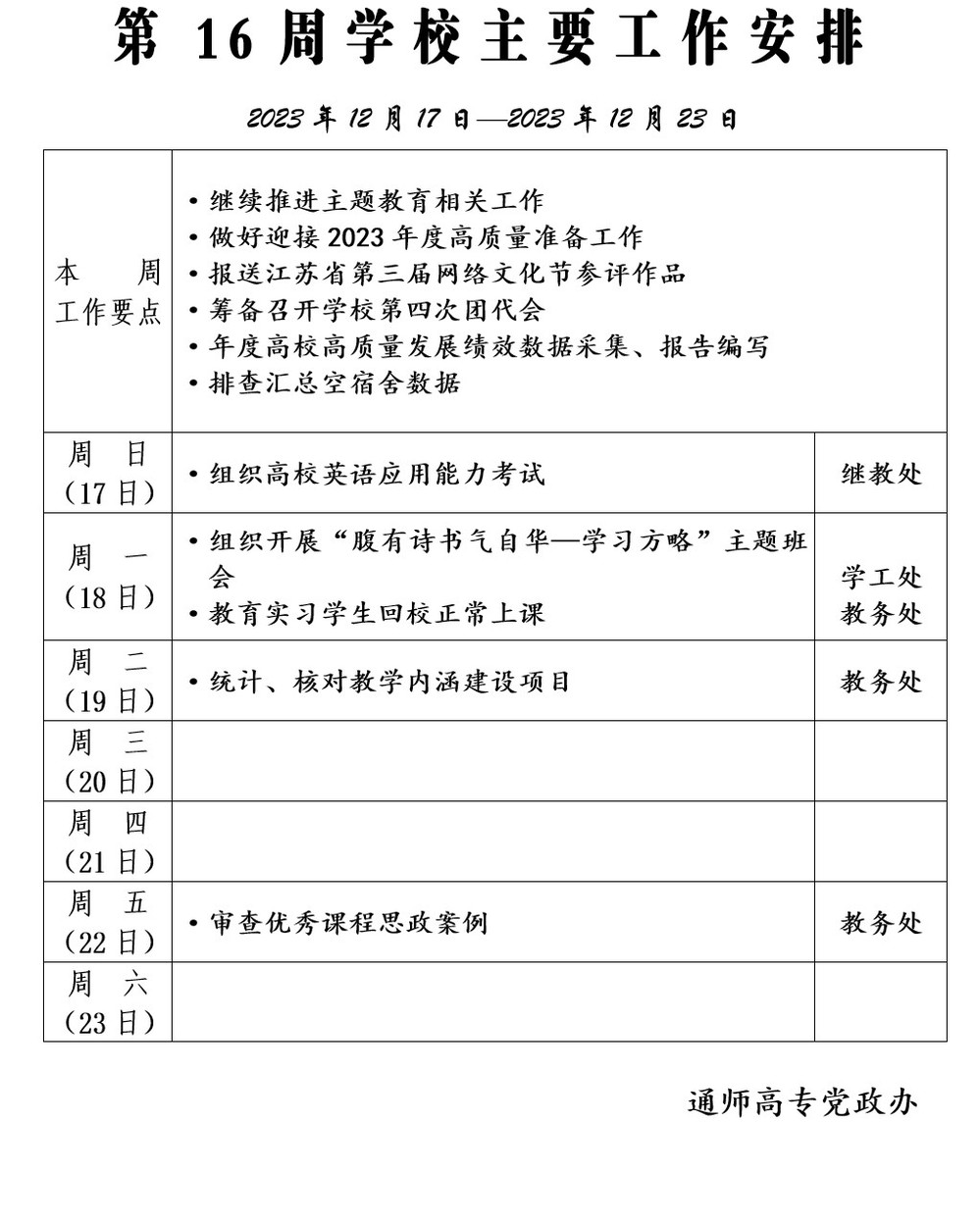 2023-2024学年第一学期第16周多盈体育(中国)主要工作安排