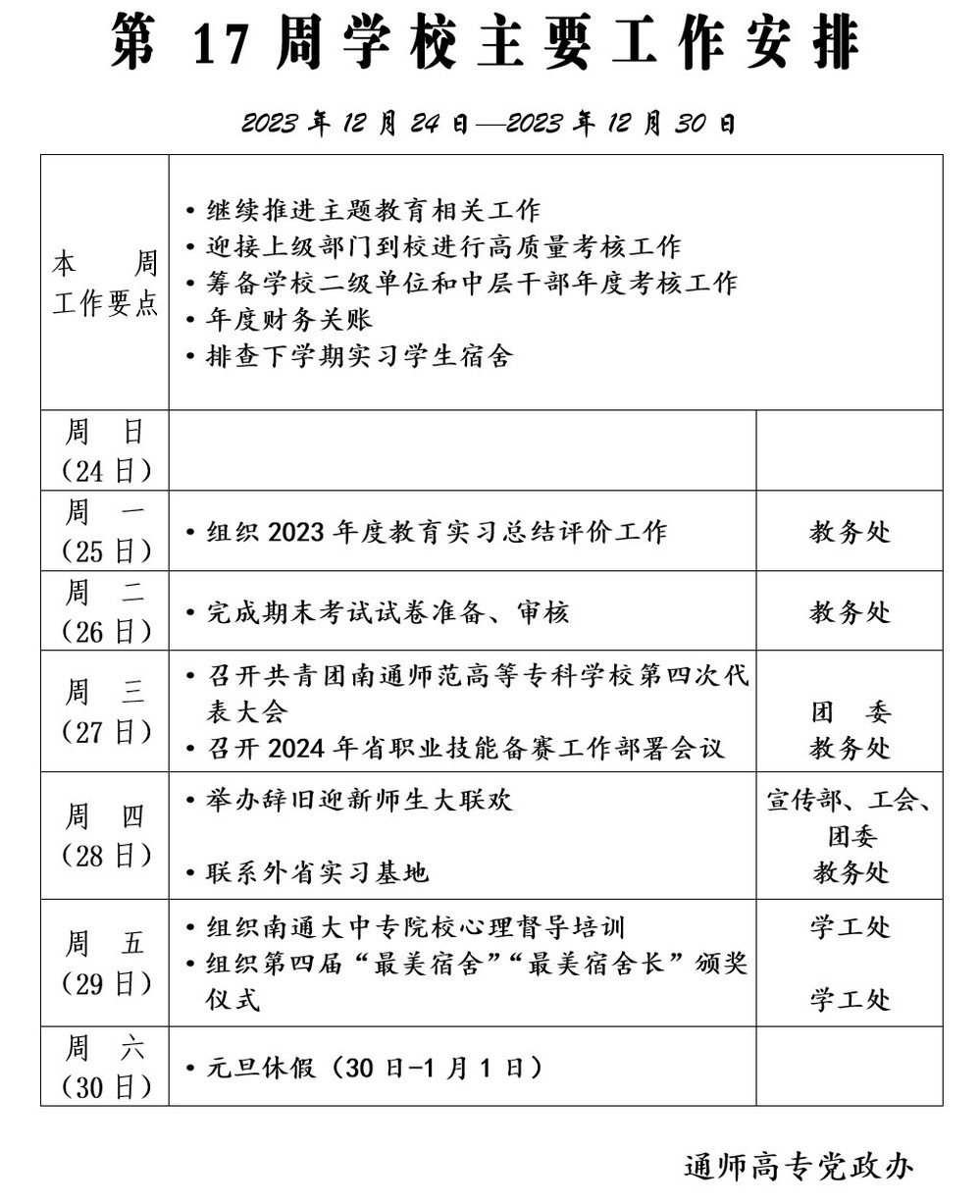 2023-2024学年第一学期第17周多盈体育(中国)主要工作安排