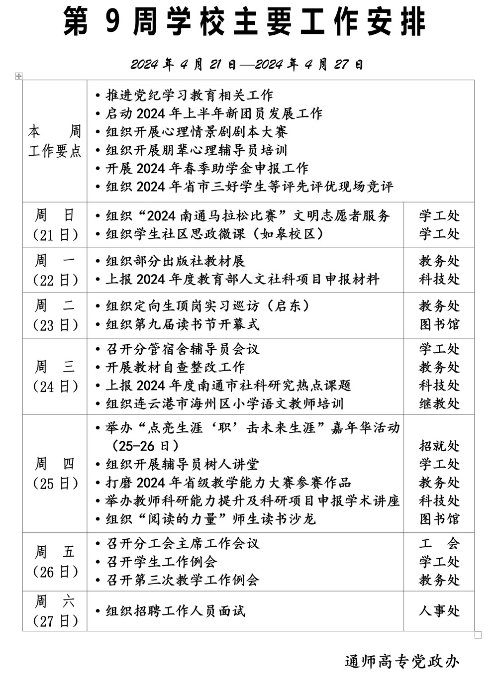 2023-2024学年第二学期第9周多盈体育(中国)主要工作安排